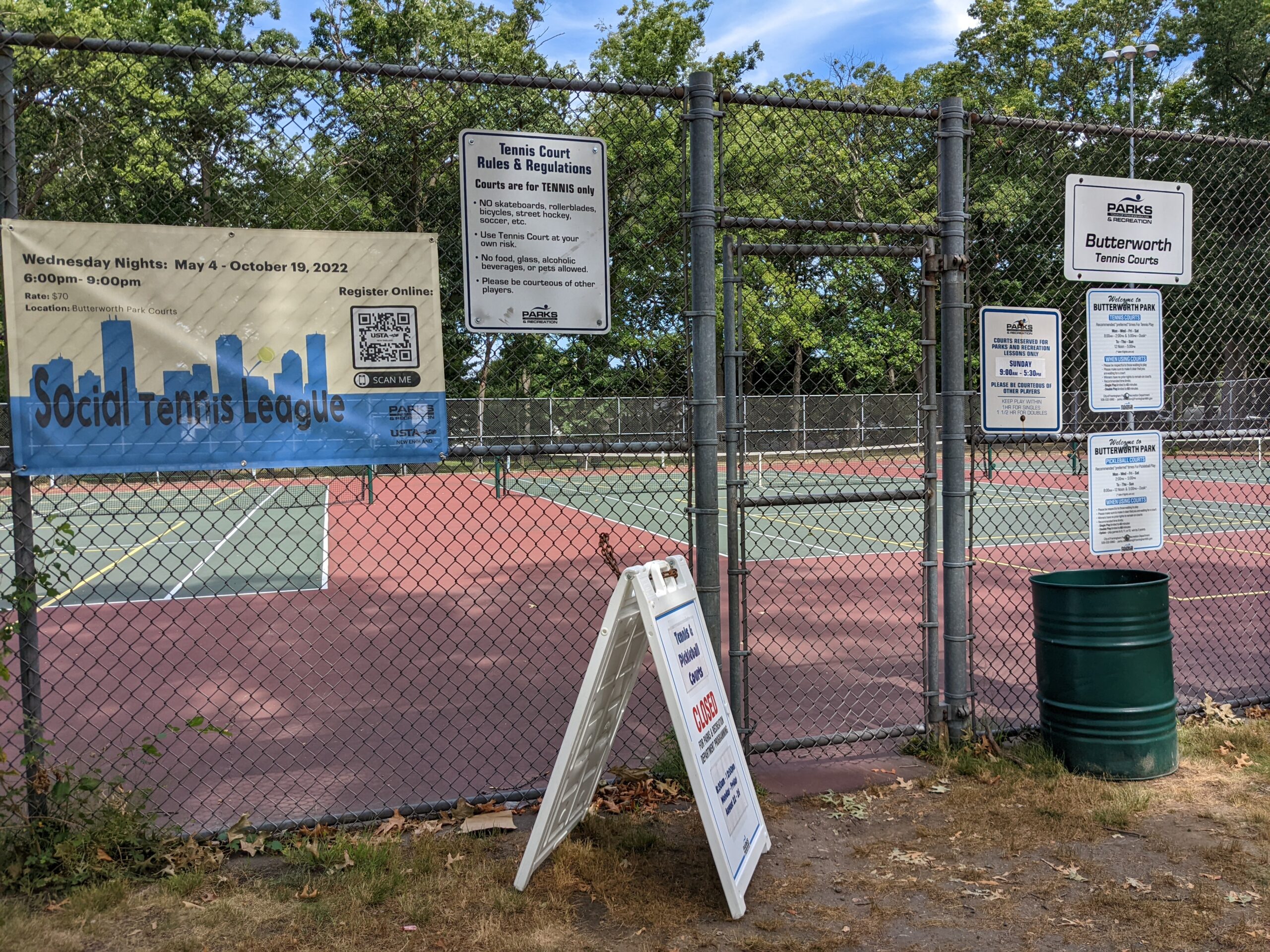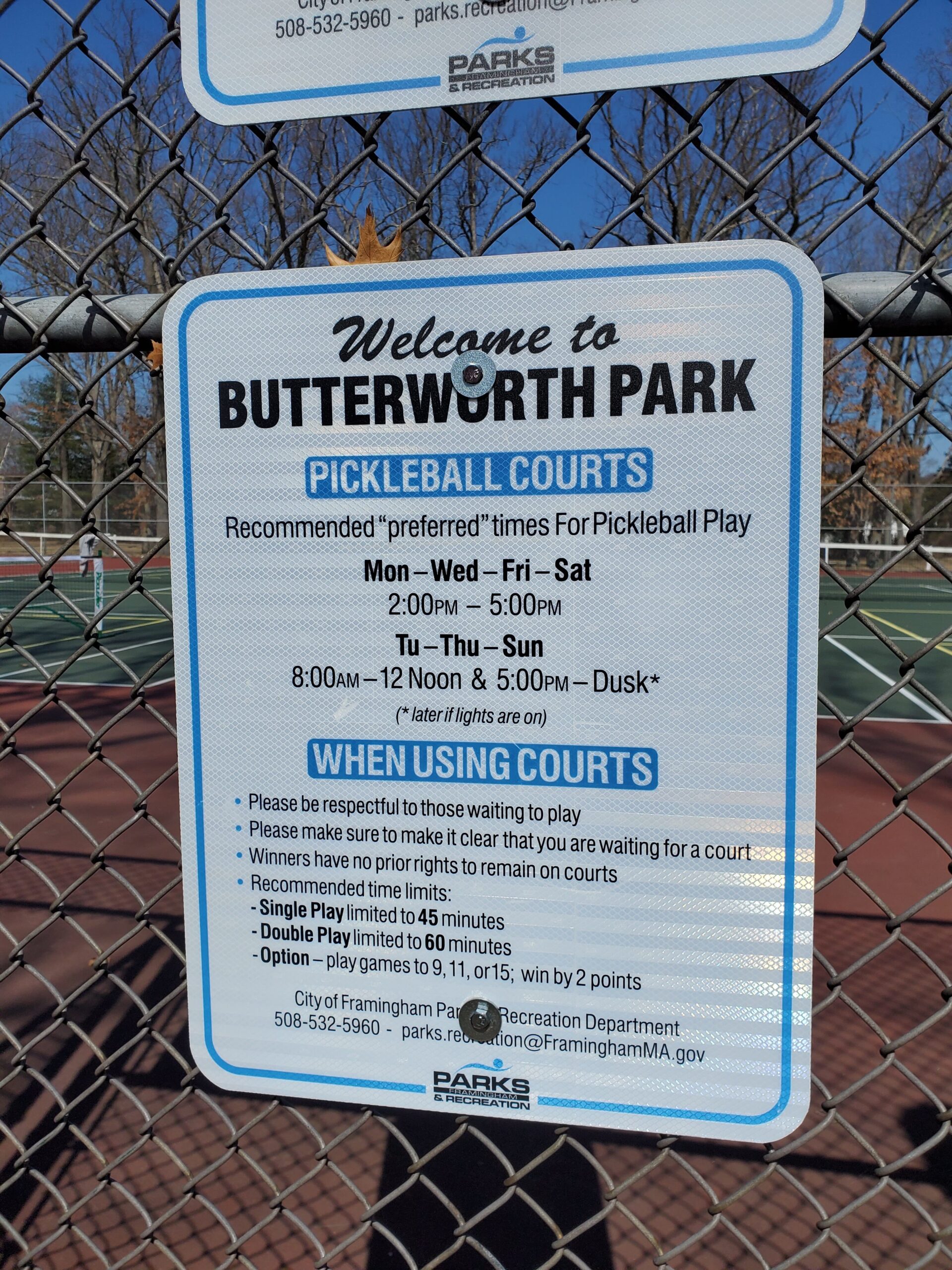 Come play pickleball at Butterworth Park in Natick, MA! There are 6 outdoor hard courts. These are dedicated courts with permanent lines and nets. The courts are free. You can’t reserve the courts. The facility includes amenities like lights. 6 dedicated pickleball courts w permanent nets. Additional 4 possible PB courts shared with tennis, BYO nets. See images for schedule.